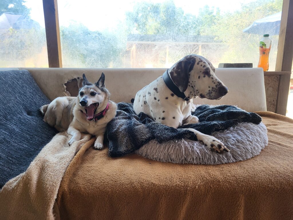 Ein zentrales Thema bei Buddy ist seine Panik bei Donner/Gewitter. Er reagiert nicht nur ängstlich, sondern wird panisch. Ähnlich wird es vermutlich auch an Silvester oder bei sehr lauten Geräuschen sein – etwa plötzlichen Knallern oder Schüssen. In solchen Momenten versucht Buddy sich durch Möbelstücke wie z. B. das Sofa zu „buddeln“, am Boden kratzt etc. Ist der Auslöser vorüber bzw. hat er eine Menschen in diesem Moment an seiner Seite, beruhigt er sich allerdings sofort und zeigt sich dann wieder völlig unauffällig. Buddy hat noch Schwierigkeiten alleine zu bleiben und wir wissen nicht, wie lange man dafür Management-Maßnahmen/Training ansetzen muss! Das muss kleinschrittig mit ihm geübt werden. Denn: Geräuschangst und Trennungsangst treten oft gemeinsam auf!
