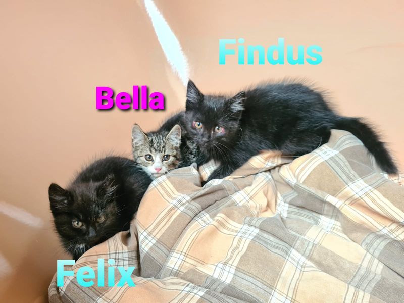 Felix, Bella und Findus, ca. 10 bis 12 Wochen jung, waren kleine Streunerchen, die zum Glück gesichert werden konnten.