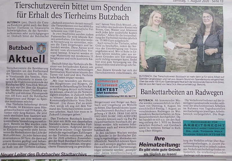 Daher sind wir sehr dankbar, dass uns Frau Dick-Wenzel, Fraktionsvorsitzende der SPD in Butzbach, mit einem Spendenaufruf unterstützt. Sie selbst hat bereits den Anfang gemacht und uns 100 € auf unser Spendenkonto eingezahlt. Wir freuen uns sehr über so viel tatkräftiges Engagement und sagen DANKESCHÖN! Wie immer auch im Namen all unserer Tiere.